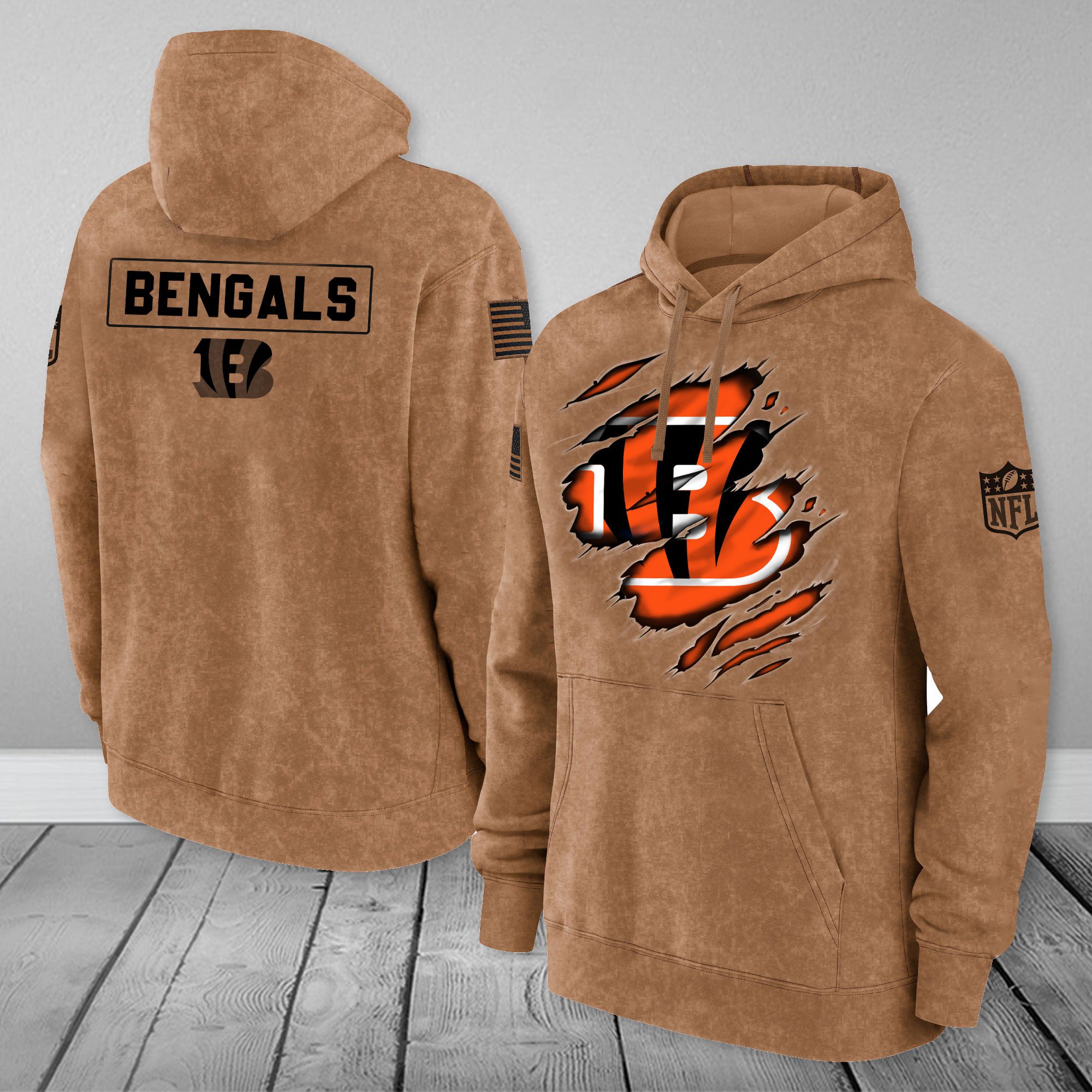Cincinnati Bengals NFL Brown Distressed Logo Salute To Service 2023 3D Hoodie HSL1039