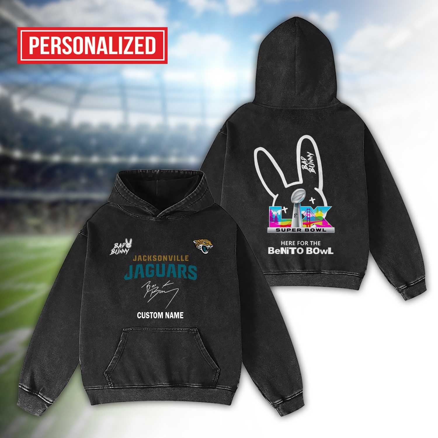 Jacksonville Jaguars Bad Bunny Super Bowl LX 2026 2D Washed Hoodie