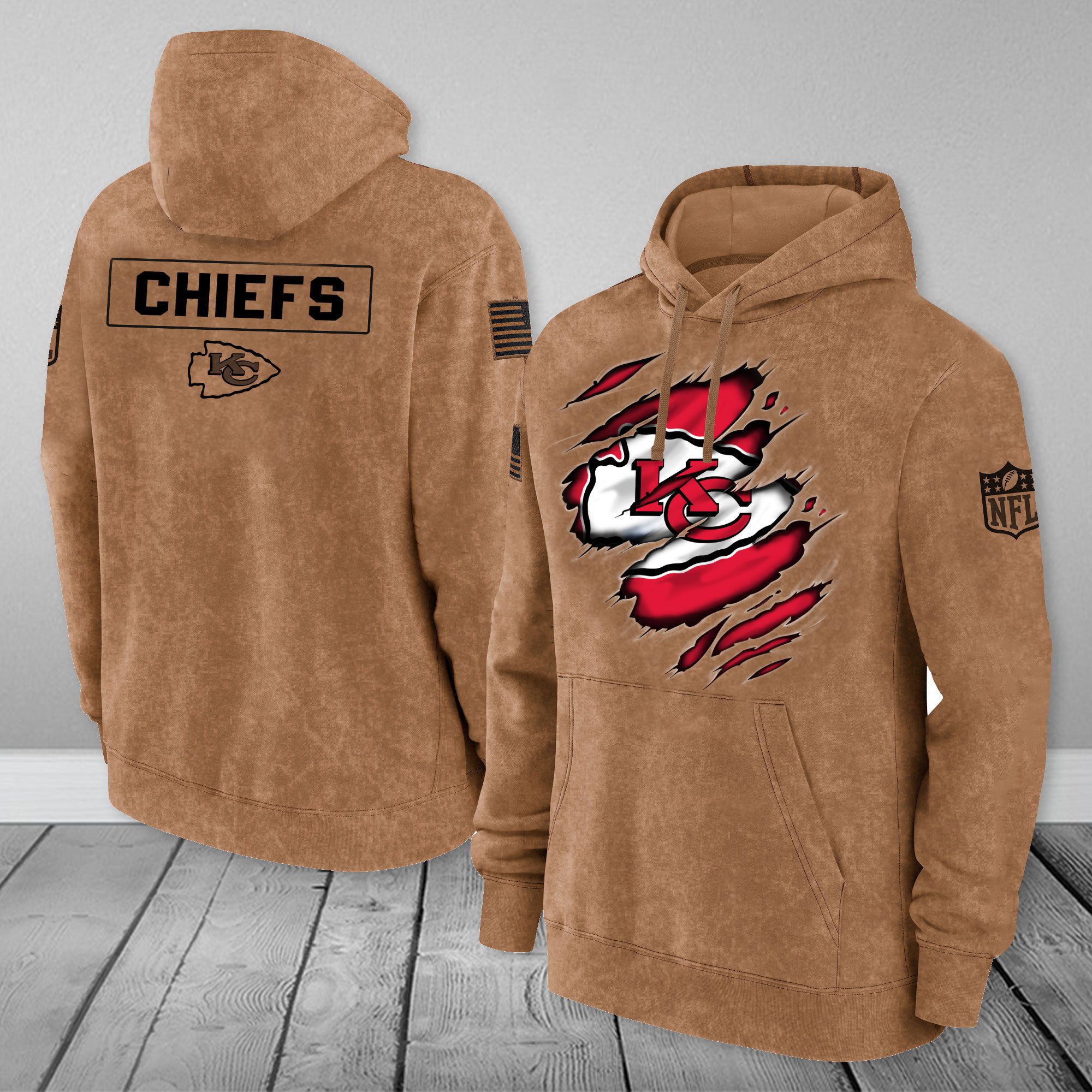 Kansas City Chiefs NFL Brown Distressed Logo Salute To Service 2023 3D Hoodie HSL1048