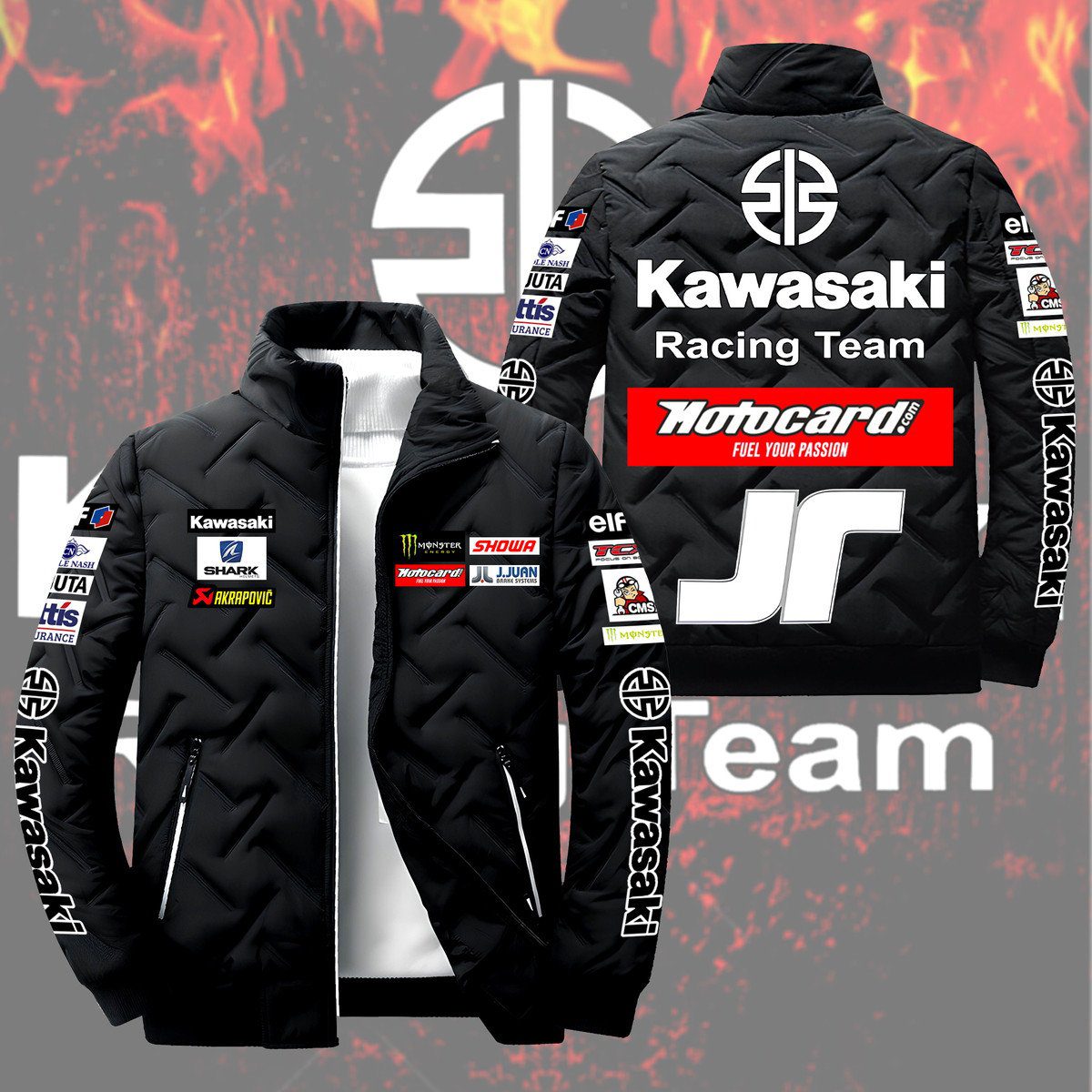 Kawasaki Racing Black Team Padded Jacket Stand Collar Coats