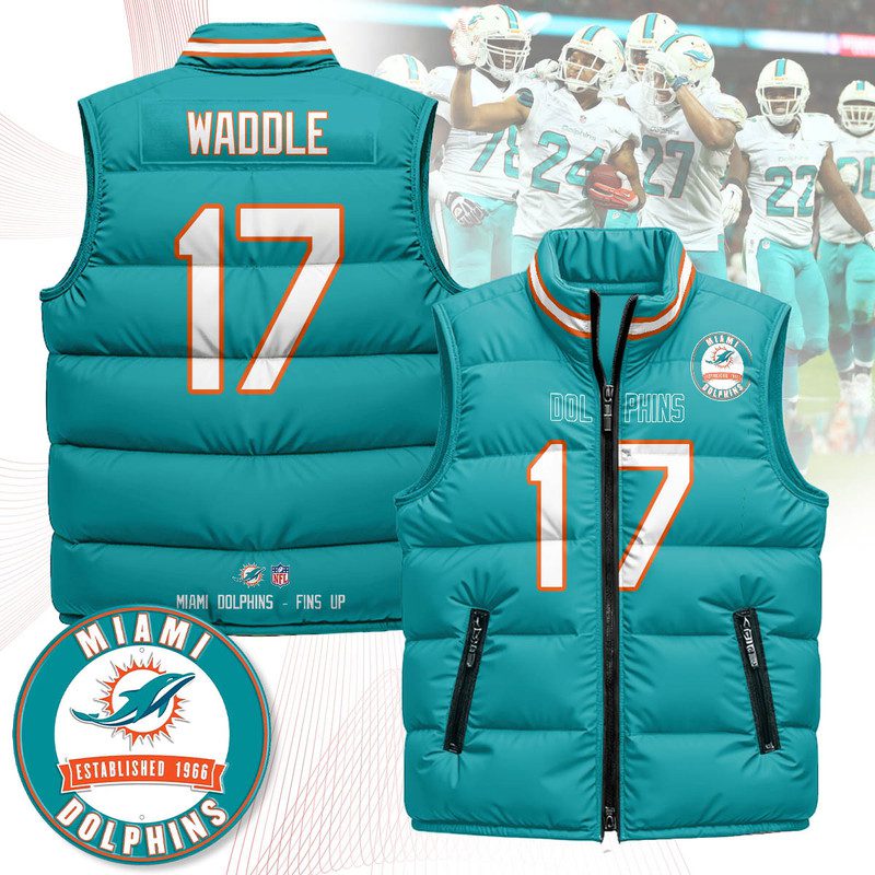 Miami Dolphins Unisex Puffer Vest Sleeveless Down Jacket- Aqua / Jaylen Waddle – 17