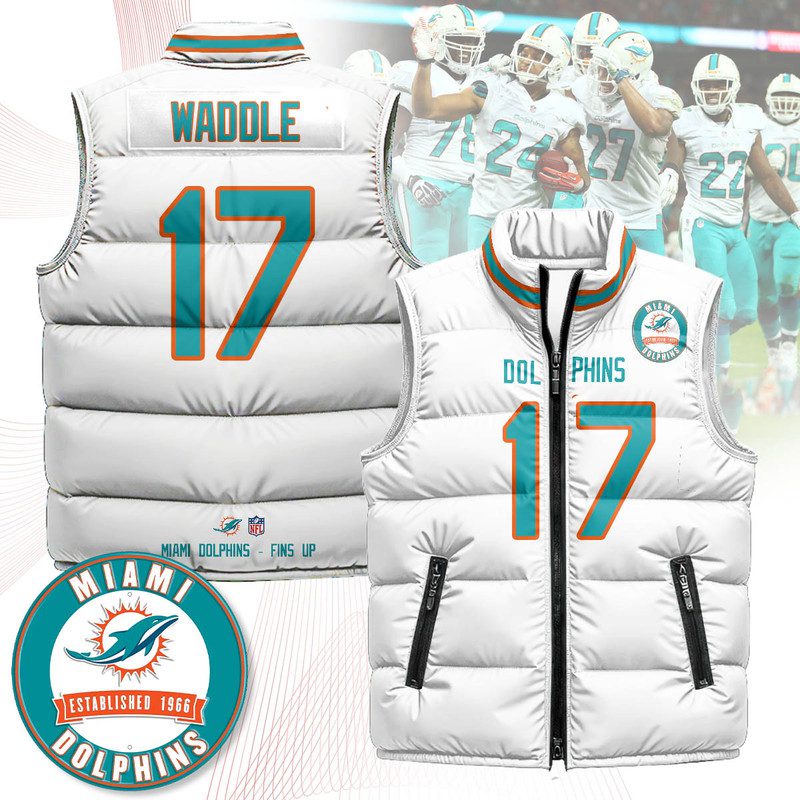Miami Dolphins Unisex Puffer Vest Sleeveless Down Jacket- White / Jaylen Waddle – 17