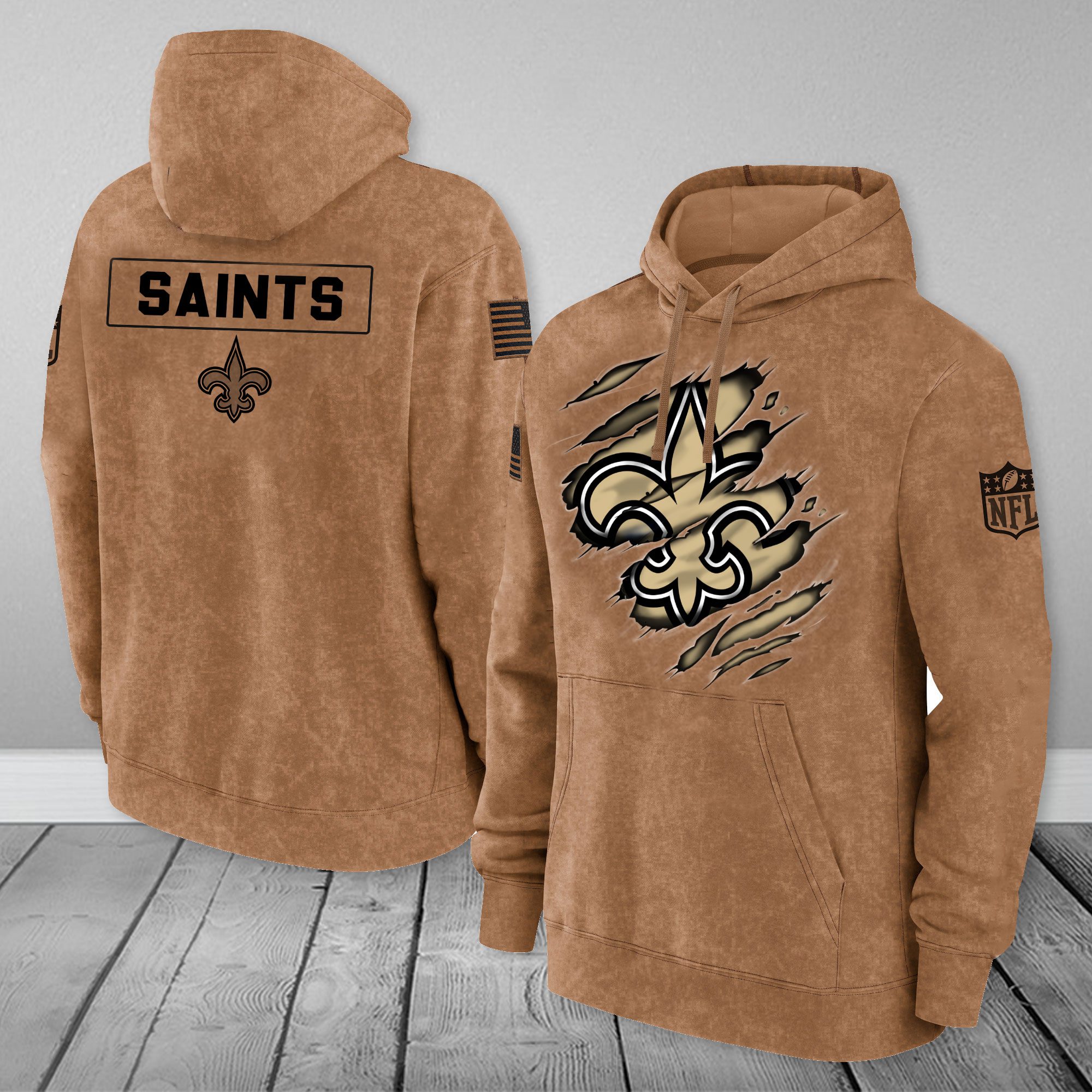 New Orleans Saints NFL Brown Distressed Logo Salute To Service 2023 3D Hoodie HSL1055