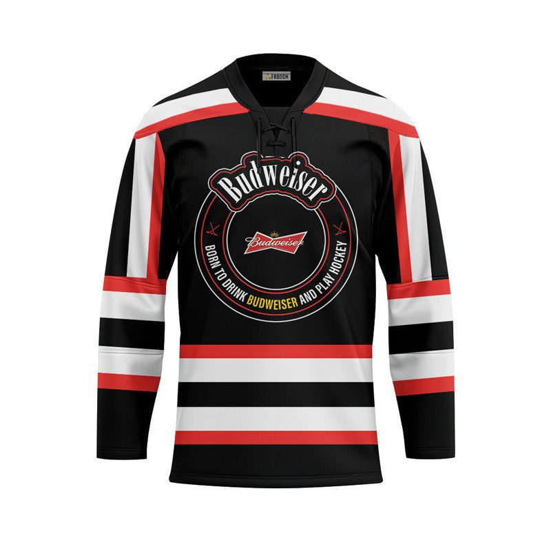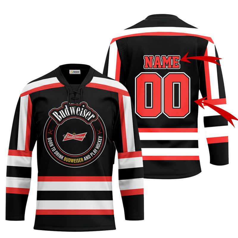 Personalized Black Born To Drink Budweiser and Play Lace Hockey Jersey