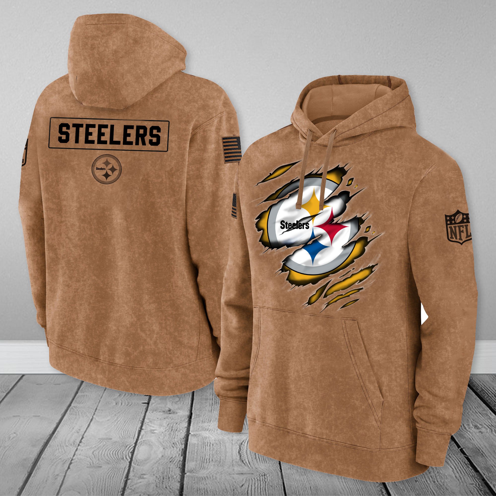 Pittsburgh Steelers NFL Brown Distressed Logo Salute To Service 2023 3D Hoodie HSL1059
