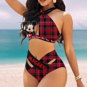 Custom Mickey Mouse Striped Pattern Women’s 2PCS Bikini Swimsuit Crisss Cross Cutout Bathing Suit EBN1072