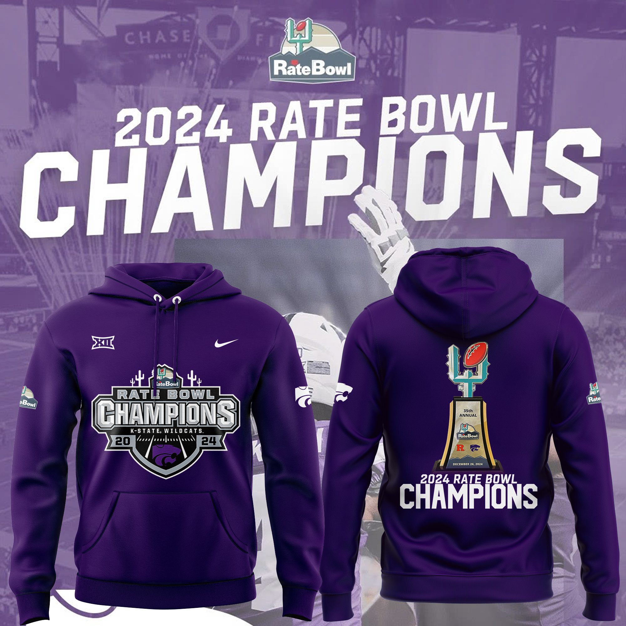 Kansas State Wildcats Football 2024 Rate Bowl Champions Hoodie BHD6013