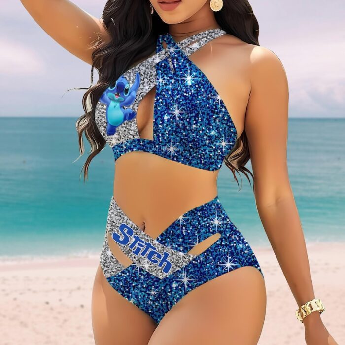 Lilo & Stitch Faux Glitter Women’s 2PCS Bikini Swimsuit Crisss Cross Cutout Bathing Suit EBN1082
