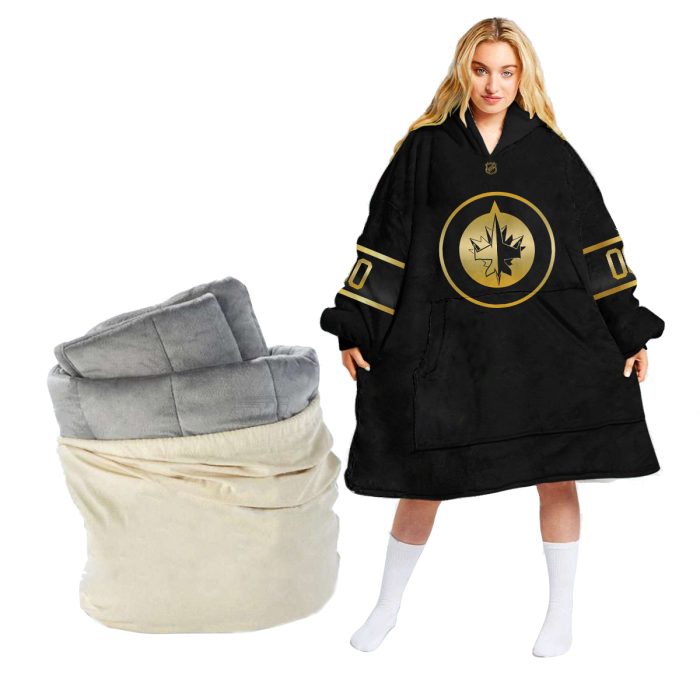 Personalized Black Golden NHL Winnipeg Jets Oodie Blanket Hoodie Wearable Blanket