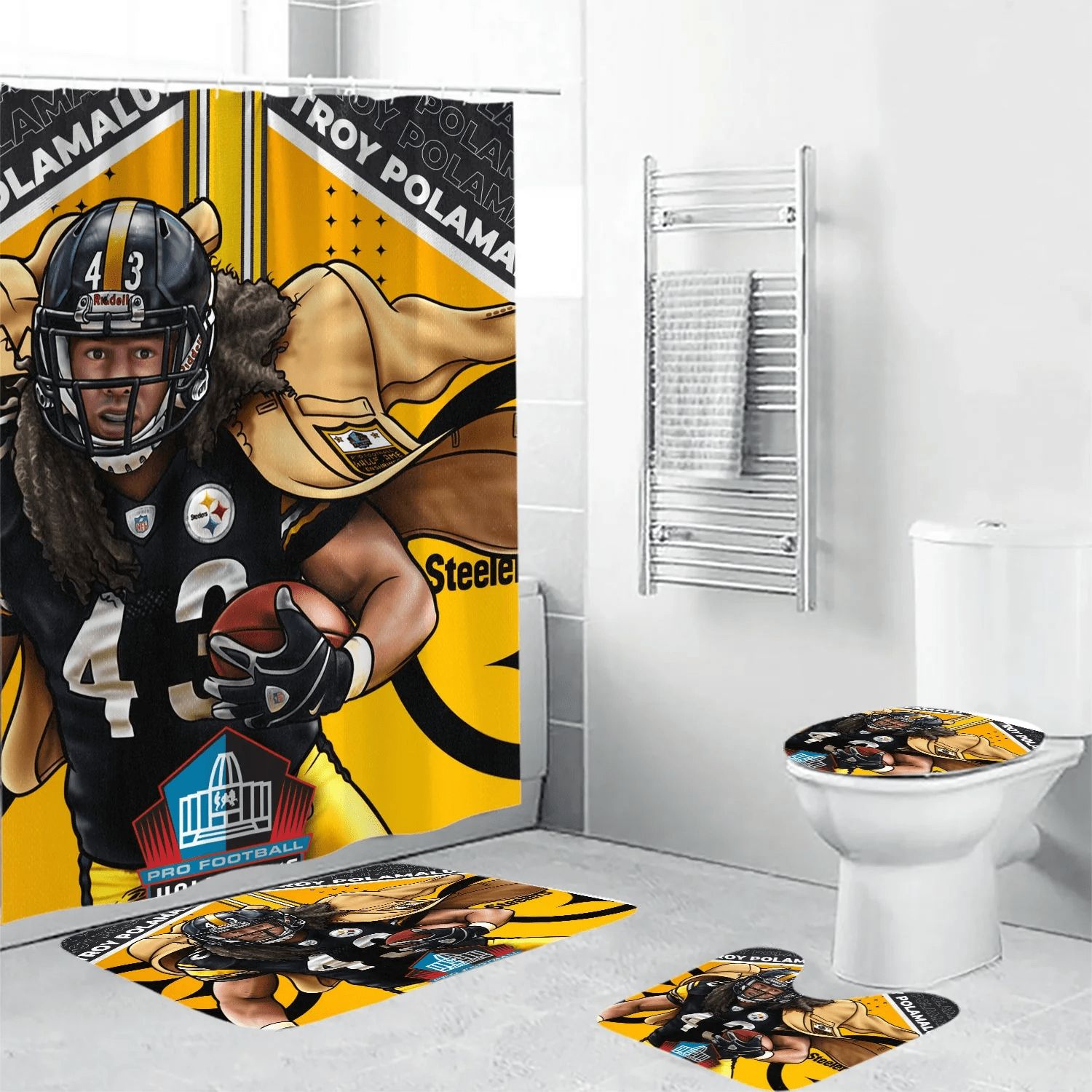 Pittsburgh Steelers Troy Polamalu 43 Art2 Waterproof Shower Curtain Non-Slip Toilet Lid Cover Bath Mat Bathroom Set BRS2621