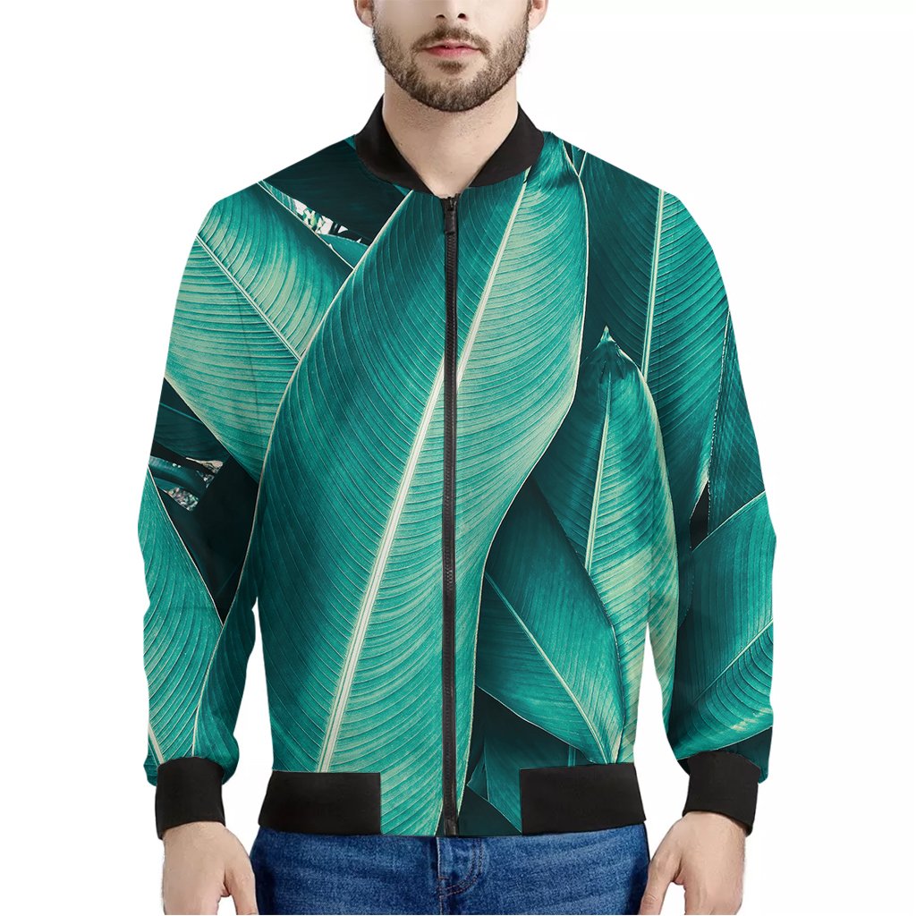 Turquoise Banana Leaf Print Bomber Jacket