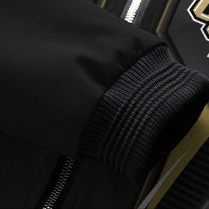 - Light bomber jacket featuring elastic cuff and collar, full zip up closure type, long sleeves, and two side pockets.
